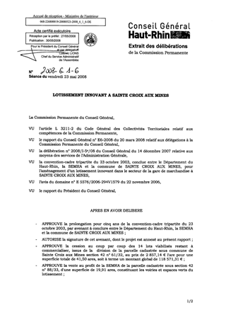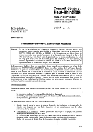 En vue de la création d'un lotissement innovant à Sainte Croix aux Mines, une convention cadre tripartite a été établie le 23 octobre 2003 entre la commune de SAINTE CROIX AUX MINES, la SEMHA et le Département du Haut-Rhin. Le présent rapport a pour objet d'approuver la prolongation de 5 ans de la durée de cette convention, permettant ainsi la poursuite de la commercialisation des lots au coup par coup pour un montant global de 118 571,31 €. Par ailleurs, il convient également d'autoriser la cession au profit de la SEMHA des voiries et espaces verts de ce lotissement au prix de 9 800,13 €.