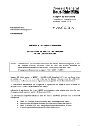 Conformément aux critères d'intervention en matière d'animation sportive, il vous est proposé d'allouer plusieurs aides au titre des actions sportives du Département dont la subvention Jeunes Licenciés Sportifs pour 2008. L'engagement financier de ce rapport s'élève à 291 178,68 €.