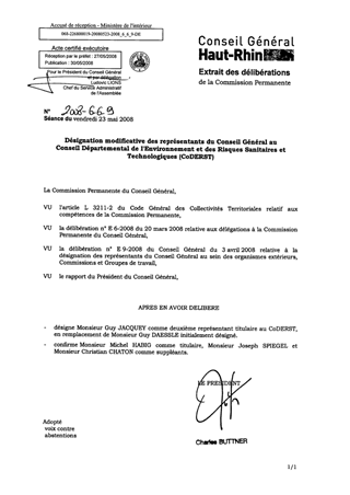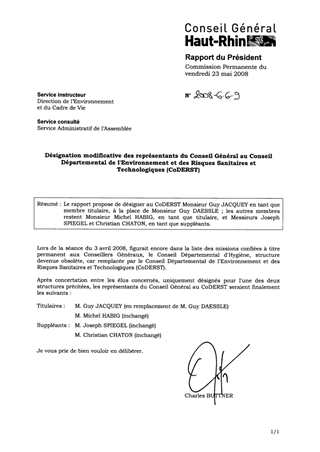 Le rapport propose de désigner au CoDERST Monsieur Guy JACQUEY en tant que membre titulaire, à la place de Monsieur Guy DAESSLE ; les autres membres restent Monsieur Michel HABIG, en tant que titulaire, et Messieurs Joseph SPIEGEL et Christian CHATON, en tant que suppléants