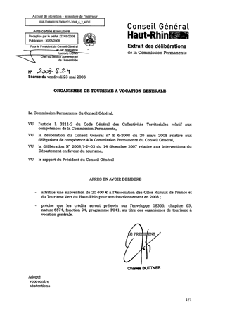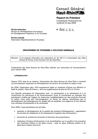 Il est proposé d'accorder une subvention de 20 400 € à l'Association des Gîtes Ruraux de France et du Tourisme Vert du Haut-Rhin.
