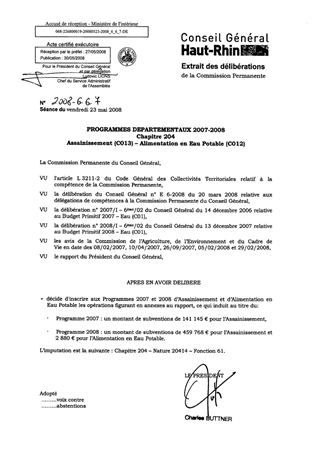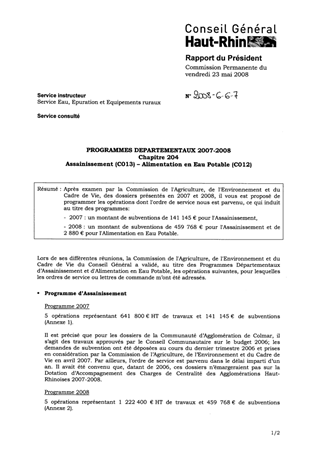 Après examen par la Commission de l'Agriculture, de l'Environnement et du Cadre de Vie, des dossiers présentés en 2007 et 2008, il vous est proposé de programmer les opérations dont l'ordre de service nous est parvenu, ce qui induit au titre des programmes: - 2007 : un montant de subventions de 141 145 € pour l'Assainissement, - 2008 : un montant de subventions de 459 768 € pour l'Assainissement et de 2 880 € pour l'Alimentation en Eau Potable.