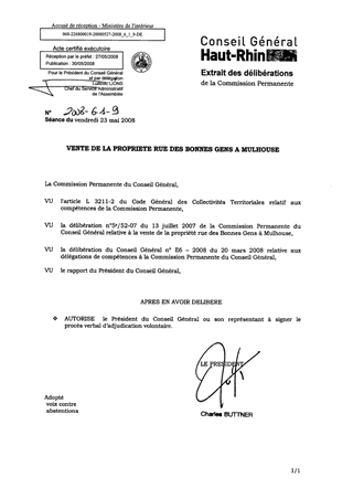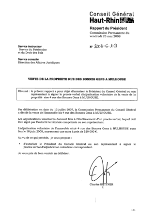 le présent rapport a pour objet d’autoriser le Président du Conseil Général ou son représentant à signer le procès-verbal d’adjudication volontaire de la vente de la propriété sise 4 rue des Bonnes Gens à MULHOUSE.