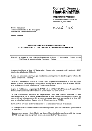Le rapport a pour objet l'affrètement de la ligne 157 Labaroche - Colmar par la TRACE pour la section urbaine Turckheim - Colmar.