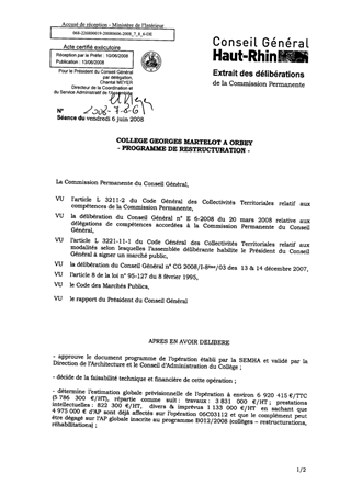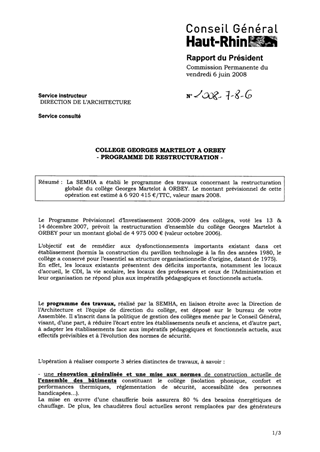 La SEMHA a établi le programme des travaux concernant la restructuration globale du collège Georges Martelot à ORBEY. Le montant prévisionnel de cette opération est estimé à 6 920 415 €/TTC, valeur mars 2008.