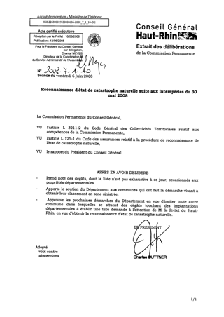 Le présent rapport a pour objet de vous informer de l'importance des dommages occasionnés aux biens de la Collectivité par l'orage qui s'est abattu sur le Haut-Rhin, le 30 mai 2008 et d’approuver les démarches du Département auprès des communes concernées pour qu'elles demandent la reconnaissance d’état de catastrophe naturelle.