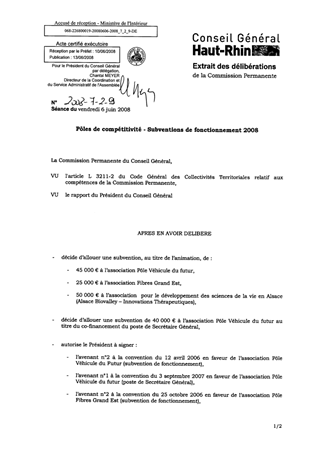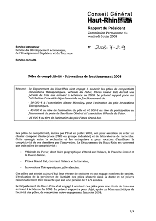 Le Département du Haut-Rhin s'est engagé à soutenir les pôles de compétitivité (Innovations Thérapeutiques, Véhicule du Futur, Fibres Grand Est) durant une période de trois ans arrivant à échéance en 2008. Le présent rapport porte sur l'attribution d'une aide départementale au fonctionnement de : - 50 000 € à l'association Alsace Biovalley, pour l'animation du pôle Innovations Thérapeutiques, - 45 000 € au titre de l'animation du pôle et 40 000 € au titre de participation au financement du poste de Secrétaire Général à l'association Véhicule du Futur, - 25 000 € au titre de l'animation du pôle Fibres Grand Est.