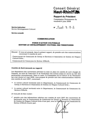 Il vous est proposé, dans le présent rapport, de prendre acte des communications concernant 2 comités de suivi : . Communauté de Communes de Cernay et Environs et Association de Gestion de l'Espace Culturel Grün ; . Communauté de Communes du Secteur d'Illfurth.