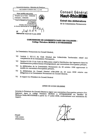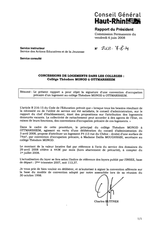 Le présent rapport a pour objet la signature d'une convention d'occupation précaire d'un logement au collège Théodore MONOD à OTTMARSHEIM.