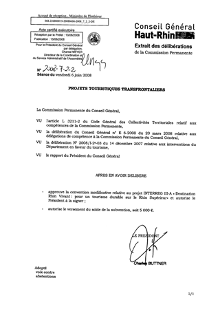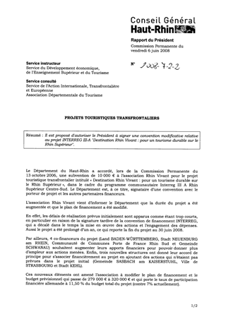 Il est proposé d'autoriser le Président à signer une convention modificative relative au projet INTERREG III-A "Destination Rhin Vivant : pour un tourisme durable sur le Rhin Supérieur".