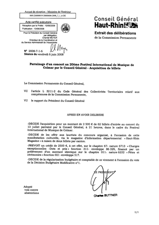 PARRAINAGE D'UN CONCERT AU 20 EME FESTIVAL INTERNATIONAL DE MUSIQUE DE COLMAR PAR LE CONSEIL GENERAL-ACQUISITION DE BILLETS