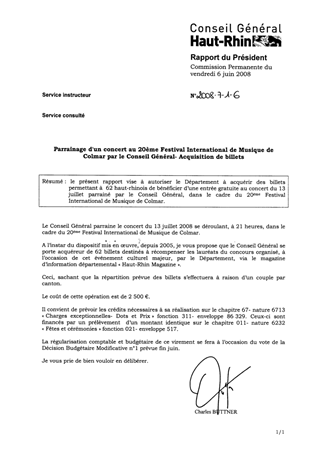 le présent rapport vise à autoriser le Département à acquérir des billets permettant à 62 haut-rhinois de bénéficier d’une entrée gratuite au concert du 13 juillet parrainé par le Conseil Général, dans le cadre du 20ème Festival International de Musique de Colmar.