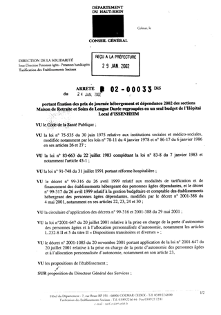 Portant fixation des prix de journée hébergement et dépendance 2002 des sections maison de retraite et soins de longue durée regroupées en un seul budget de l'hôpital local d'Issenheim Resumé Pièces jointes ARRETE Assemblée : Non défini Date : 29/01/2002 Rapporteur : Non défini Collectivité : Conseil départemental du Haut-Rhin Direction : Non défini Service : Service de la Tarification des Etablissements Domaine : Prix de Journée Commission :