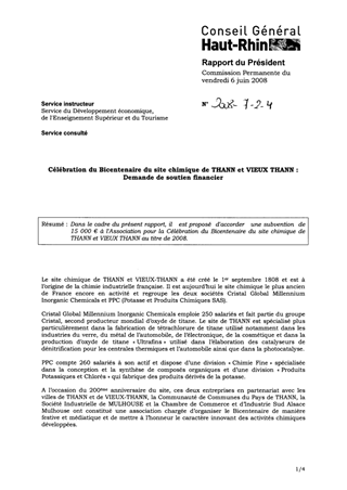 Dans le cadre du présent rapport, il est proposé d'accorder une subvention de 15 000 € à l'Association pour la Célébration du Bicentenaire du site chimique de THANN et VIEUX THANN au titre de 2008.