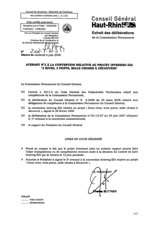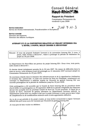 Il vous est proposé d'adopter l'avenant à la convention Interreg IIIA "2 rives, 3 ponts, mille choses à découvrir", visant à prolonger la période de réalisation du projet au 30 juin 2008.
