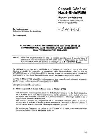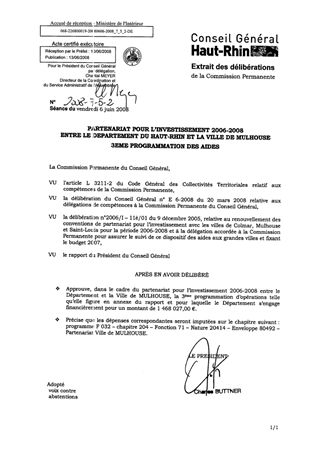 PARTENARIAT POUR L'INVESTISSEMENT 2006-2008 ENTRE LE DEPARTEMENT DU HAUT-RHIN ET LA VILLE DE MULHOUSE : 3ème PROGRAMMATION DES AIDES