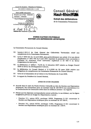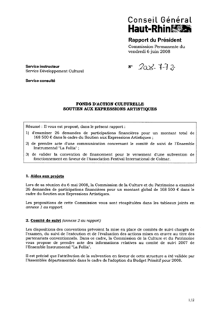 FONDS D'ACTION CULTURELLE SOUTIEN AUX EXPRESSIONS ARTISTIQUES Resumé Pièces jointes DELIBERATION RAPPORT Assemblée : Commission Permanente Date : 06/06/2008 Rapporteur : Non défini Collectivité : Conseil départemental du Haut-Rhin Direction : Non défini Service : Service du développement culturel Domaine : Commission : Commission Permanente