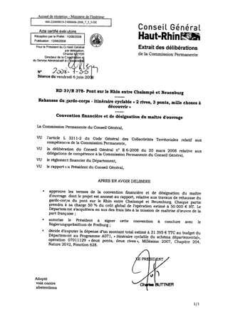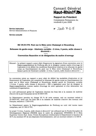 RD 39/B 378 – PONT SUR LE RHIN ENTRE CHALAMPE ET NEUENBURG REHAUSSE DU GARDE-CORPS – ITINERAIRE CYCLABLE 2 RIVES, 3 PONTS, MILLE CHOSES A DECOUVRIR CONVENTION FINANCIERE ET DE DESIGNATION DU MAITRE D’OUVRAGE