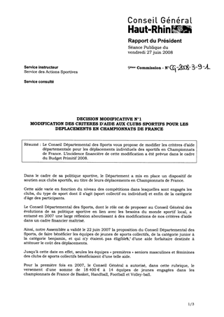 Le Conseil Départemental des Sports vous propose de modifier les critères d’aide départementale pour les déplacements individuels des sportifs en Championnats de France. L’incidence financière de cette modification a été prévue dans le cadre du Budget Primitif 2008.