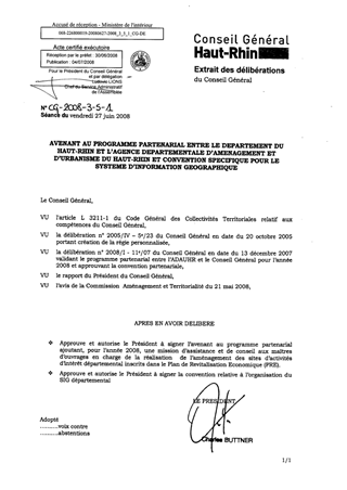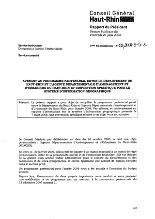 Avenant au programme partenarial entre le département du Haut Rhin et l'Agence départementale d'aménagement et d'urbanisme du Haut Rhin et convention spécifique pour le système d'information géographique Resumé Pièces jointes DELIBERATION RAPPORT Assemblée : Conseil General Date : 27/06/2008 Rapporteur : Non défini Collectivité : Conseil départemental du Haut-Rhin Direction : Non défini Service : Direction à l'Action Territorialisée Domaine : Culture Commission : Assemblée Départementale