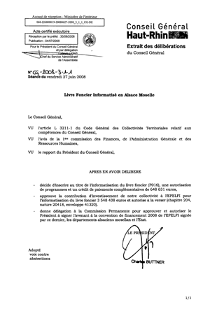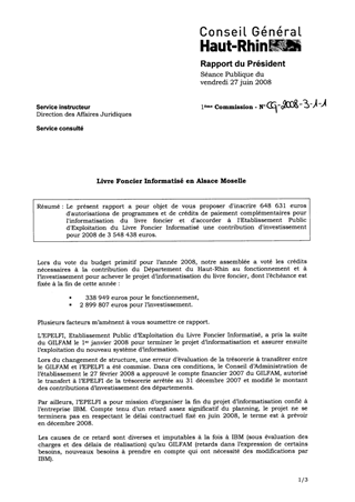 Le présent rapport a pour objet de vous proposer d'inscrire 648 631 euros d'autorisations de programmes et de crédits de paiement complémentaires pour l'informatisation du livre foncier et d'accorder à l'Etablissement Public d'Exploitation du Livre Foncier Informatisé une contribution d'investissement pour 2008 de 3 548 438 euros