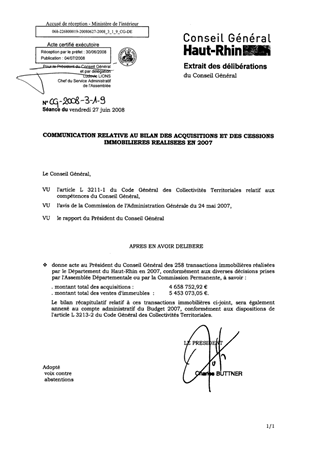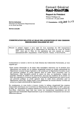le présent rapport a pour objet de vous soumettre les 258 transactions immobilières réalisées par le Département du Haut-Rhin au cours de l'année 2007, ainsi que le bilan de ces opérations qui sera annexé au compte administratif 2007. Acquisitions : 4 658 752,92 € - Ventes : 5 453 073,05 €.