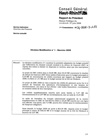 La décision modificative n°1 constitue la première adaptation du budget primitif par l’affectation du résultat cumulé constaté à la clôture de l’exercice 2007, la reprise des restes à réaliser en dépenses et recettes, ainsi que des inscriptions nouvelles. Le projet de DM1 s'élève donc à 33,66 M€, dont 33,33 M€ concernent le résultat de clôture de l’exercice 2007 (hors soldes d’exécution pour le budget principal) et 0,33 M€ de mouvements de crédits nouveaux par rapport au budget primitif 2008. Il s’élève à 0,43 M€ pour le budget annexe de la Cité de l'Enfance. Ce projet de DM1 2008 ne vise à inscrire les crédits de paiement qu’au fur et à mesure de l’avancée des opérations d’investissement et des besoins de fonctionnement, ceci dans le but d’éviter « des bulles financières » inutilisables au moment même de leur inscription. Les crédits supplémentaires inscrits sont ainsi limités à 7,47 M€ (en fonctionnement) et à 5,97 M€ (en investissement), soit un total de 13,44 M€. Le solde de l’excédent du Compte administratif (augmenté de la recette supplémentaire en DM1 de 323 822 €) s’élève à 20,20 M€ inscrits sur une ligne non affectée. Une partie, soit 7,9 M€, pourra être utilisée pour le remboursement de l’emprunt obligataire. Ainsi abondé, le budget 2008 est porté à 863,31 M€, répartis entre le budget principal à raison de 858,32 M€ et le budget annexe de la Cité de l'Enfance à hauteur de 4,99 M€.