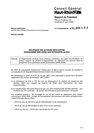 Le Département attribue, sous certaines conditions, des aides aux étudiants. Le présent rapport est destiné à l’approbation du règlement des bourses dans la perspective de la prochaine année universitaire (2008/2009).