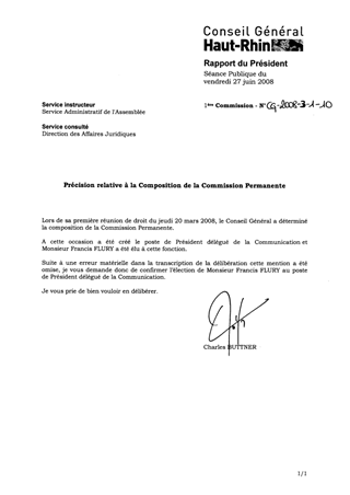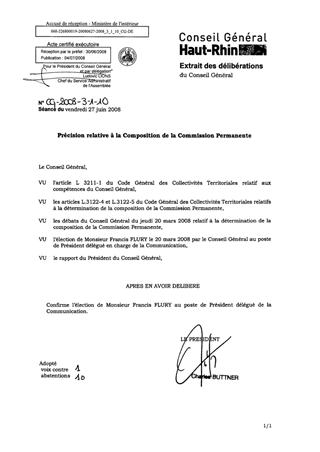 PRECISION RELATIVE A LA COMPOSITION DE LA COMMISSION PERMANENTE Resumé Pièces jointes DELIBERATION RAPPORT Assemblée : Conseil General Date : 27/06/2008 Rapporteur : Non défini Collectivité : Conseil départemental du Haut-Rhin Direction : Non défini Service : Service Administratif de l'Assemblée Domaine : Environnement Commission : Assemblée Départementale