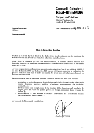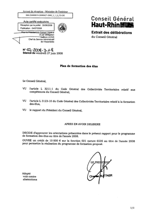 PLAN DE FORMATION DES ELUS Resumé Pièces jointes DELIBERATION RAPPORT Assemblée : Conseil General Date : 27/06/2008 Rapporteur : Non défini Collectivité : Conseil départemental du Haut-Rhin Direction : Non défini Service : Cabinet Domaine : Environnement Commission : Assemblée Départementale