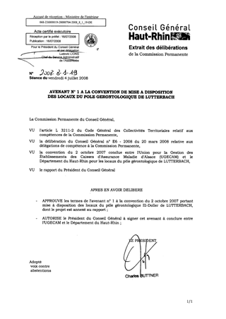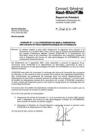 Le présent rapport a pour objet d'approuver la signature d'un avenant à la convention du 2 octobre 2007, entre l'Union pour la Gestion des Établissements des Caisses d'Assurance Maladie d'Alsace (UGECAM) et le Département du Haut-Rhin, dans le but d’entériner une modification aux conditions initiales de mise à disposition des locaux du pôle gérontologique de LUTTERBACH, sans conséquence financière directe.