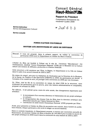 Il vous est proposé, dans le présent rapport, de valider la convention de partenariat 2008 entre le Département et l'Atelier du Rhin à Colmar.