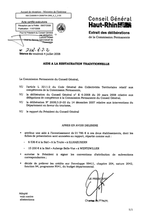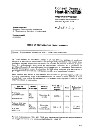 Aide à la restauration traditionnelle Resumé Il est proposé d'attribuer une aide 21 786 € à deux restaurants. Pièces jointes DELIBERATION RAPPORT Assemblée : Commission Permanente Date : 04/07/2008 Rapporteur : Non défini Collectivité : Conseil départemental du Haut-Rhin Direction : Non défini Service : Service Développement Economique Domaine : Agriculture Commission : Commission Permanente