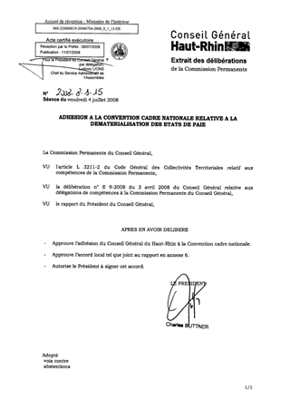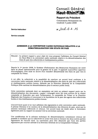 Le présent rapport a pour objet de vous proposer l’adhésion du Conseil Général du Haut-Rhin à la convention cadre nationale relative à la dématérialisation des états de paie des collectivités et établissements publics.