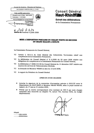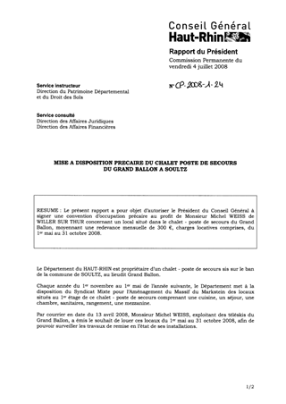 Le présent rapport a pour objet d’autoriser le Président du Conseil Général à signer une convention d’occupation précaire au profit de Monsieur Michel WEISS de WILLER SUR THUR concernant un local situé dans le chalet - poste de secours du Grand Ballon, moyennant une redevance mensuelle de 300 €, charges locatives comprises, du 1er mai au 31 octobre 2008.