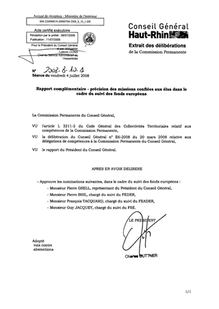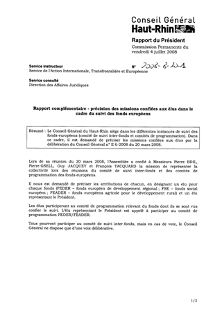 Le Conseil Général du Haut-Rhin siège dans les différentes instances de suivi des fonds européens (comité de suivi inter-fonds et comités de programmation). Dans ce cadre, il est demandé de préciser les missions confiées aux élus par la délibération du Conseil Général n° E 6-2008 du 20 mars 2008.