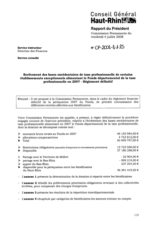 Il est proposé à la Commission Permanente, dans le cadre du règlement financier définitif de la péréquation 2007 du Fonds de prendre connaissance des différentes recettes affectées aux bénéficiaires.