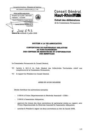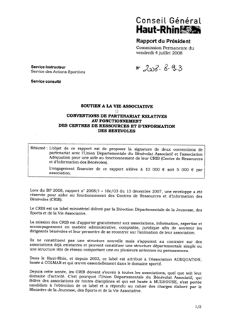 L’objet de ce rapport est de proposer la signature de deux conventions de partenariat avec l’Union Départementale du Bénévolat Associatif et l’association Adéquation pour une aide au fonctionnement de leur CRIB (Centre de Ressources et d’Information des Bénévoles). L'engagement financier de ce rapport s'élève à 10 000 € soit 5 000 € par association.