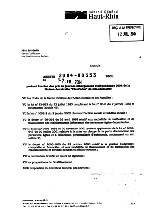 Portant fixation des prix de journée hébergement et dépendance 2004 de la Maison de retraite " Père Faller" de BELLEMAGNY Resumé Pièces jointes ARRETE Assemblée : Non défini Date : 07/07/2004 Rapporteur : Non défini Collectivité : Conseil départemental du Haut-Rhin Direction : Non défini Service : Service de la Tarification des Etablissements Domaine : Prix de Journée Commission :