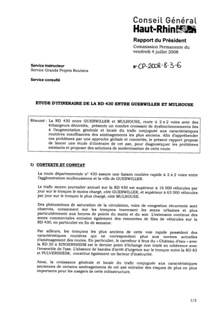 La RD 430 entre GUEBWILLER et MULHOUSE, route à 2 x 2 voies avec des échangeurs dénivelés, présente un nombre croissant de dysfonctionnements liés à l’augmentation générale et locale du trafic conjuguée aux caractéristiques routières insuffisantes des aménagements les plus anciens. Afin d’appréhender ces problèmes par une approche globale et concertée, le présent rapport propose de lancer une étude d'itinéraire de cet axe, pour diagnostiquer les problèmes existants et proposer des solutions de modernisation de cette route.