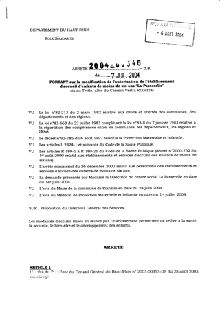portant sur la modification de l'établissement d'accueil d'enfants de moins de six ans "La Passerelle" sis au Trèfle, allée du Chemin Vert à RIXHEIM. Resumé Pièces jointes ARRETE Assemblée : Non défini Date : 07/07/2004 Rapporteur : Non défini Collectivité : Conseil départemental du Haut-Rhin Direction : Non défini Service : Direction de la Solidarité Domaine : Accueil d'enfants Commission :