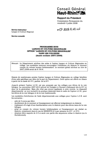 Le Département attribue des aides à l’option Langue et Culture Régionales en collège. Les modalités retenues encouragent l’utilisation du dialecte et tiennent compte du volume horaire hebdomadaire. Le montant global attribué au titre de 2007/2008 serait de 8 195 €.