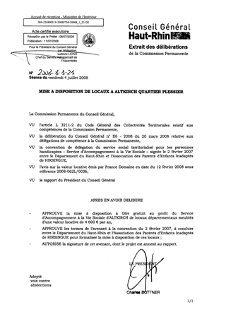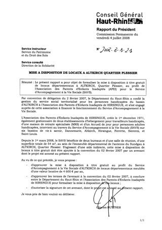 Le présent rapport a pour objet de formaliser la mise à disposition à titre gratuit de locaux départementaux à ALTKIRCH, Quartier Plessier, au profit de l’Association des Parents d’Enfants Inadaptés (APEI) pour le Service d’Accompagnement à la Vie Sociale (SAVS).
