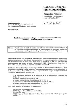 Dans le cadre du fonds de soutien aux colloques et manifestations scientifiques, il est proposé d'allouer une subvention de fonctionnement de 6 000 € à l'Université Louis Pasteur pour l'organisation de quatre manifestations scientifiques.