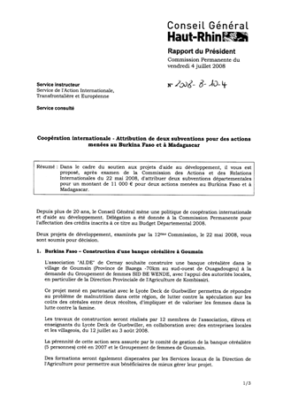 Dans le cadre du soutien aux projets d'aide au développement, il vous est proposé, après examen de la Commission des Actions et des Relations Internationales du 22 mai 2008, d'attribuer deux subventions départementales pour un montant de 11 000 € pour deux actions menées au Burkina Faso et à Madagascar.