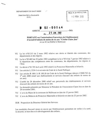 Portant sur l'autorisation d'ouverture de l'établissement d'accueil d'enfants de moins de six ans "Crèche Claire Joie" sis au 42 rue Kléber à Mulhouse Resumé Pièces jointes ARRETE Assemblée : Non défini Date : 29/01/2002 Rapporteur : Non défini Collectivité : Conseil départemental du Haut-Rhin Direction : Non défini Service : Direction de la Solidarité Domaine : Accueil d'enfants Commission :