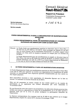 Le Fonds d'aide aux manifestations sportives se déroulant dans le Haut-Rhin a été doté lors du BP 2008 de 170 000 €. Cette enveloppe est répartie au cas par cas, en cours d'année, par la Commission Permanente. Le présent rapport vous propose une 5ème série de dossiers à prendre en compte pour un montant de 25 800 €. Le Fonds départemental pour les manifestations et congrès se déroulant dans le Haut-Rhin a été doté au BP 2008 d’un crédit de 38 000 €. Le présent rapport vous propose d’attribuer une aide de 2 500 € au Comité Départemental de Badminton et une aide de 300 € à la Ligue d’Alsace de Tennis de Table.