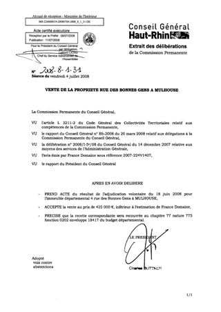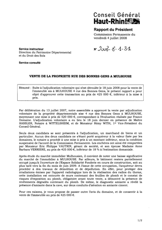 Suite à l'adjudication volontaire qui s’est déroulée le 18 juin 2008 pour la vente de l'immeuble sis à MULHOUSE 4 rue des Bonnes Gens, le présent rapport a pour objet d'approuver cette transaction au prix de 425 000 €, inférieur à la mise à prix