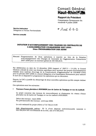 Programmation de deux opérations à inscrire au titre de la Dotation d'Accompagnement des Charges de Centralité de l'Agglomération Colmarienne 2007-2008 pour un montant global de 330 000,00 €.
