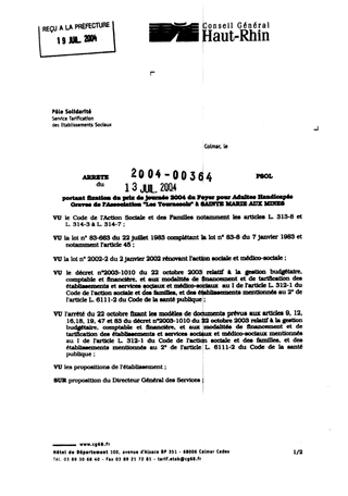 Portant fixation du prix de journée 2004 du Foyer pour Adultes Handicapés Graves de l'Association "Les Tournesols" à SAINTE MARIE AUX MINES Resumé Pièces jointes ARRETE Assemblée : Non défini Date : 13/07/2004 Rapporteur : Non défini Collectivité : Conseil départemental du Haut-Rhin Direction : Non défini Service : Service de la Tarification des Etablissements Domaine : Prix de Journée Commission :