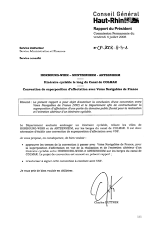 Horbourg-Wihr - Muntzenheim - Artzenheim - Itinéraire cyclable le long du canal de Colmar - Convention de superposition d'affectation avec voies navigables de France